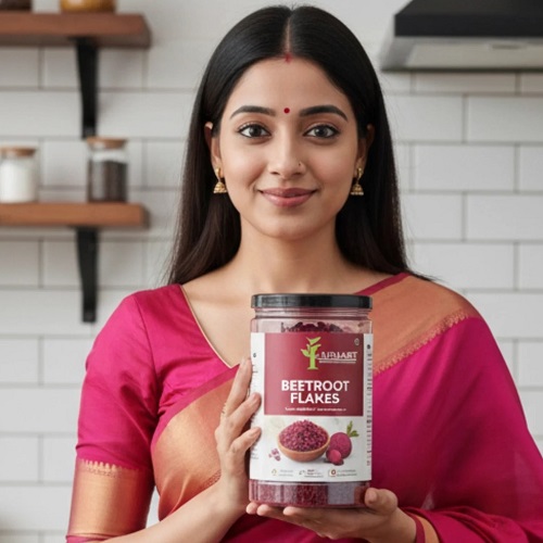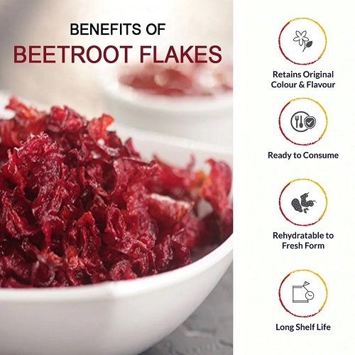 Beetroot flakes are made by drying and slicing fresh beetroots, preserving their natural color, earthy flavor, and nutrients. They are used in soups, salads, snacks, ready-to-eat meals, and as a natural food colorant. Rich in iron, folate, nitrates, and antioxidants, they support blood circulation, stamina, and detoxification. Beetroot flakes offer a convenient, long-shelf-life alternative to fresh beets.