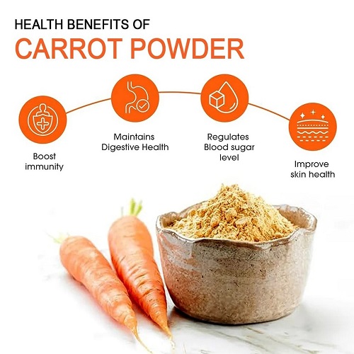 Carrot powder is made by drying and finely grinding fresh carrots, retaining their natural sweetness, color, and nutrients. It is used in soups, baby foods, bakery products, health drinks, and dietary supplements. Rich in beta-carotene (Vitamin A), fiber, and antioxidants, it supports eye health, immunity, and skin health. The powder offers a long shelf life and easy incorporation into recipes.