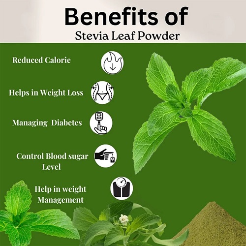 Stevia powder is a natural sweetener made from the dried and ground leaves of the Stevia plant, offering sweetness without calories. It is widely used in beverages, desserts, baked goods, and diabetic-friendly products as a sugar substitute. Stevia is 200?300 times sweeter than sugar and does not raise blood glucose levels. It supports weight management and is safe for diabetics.