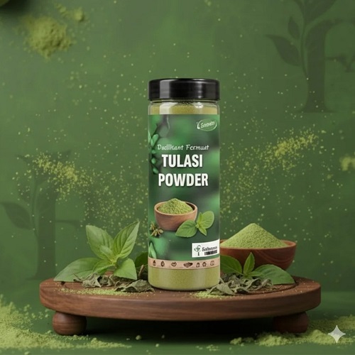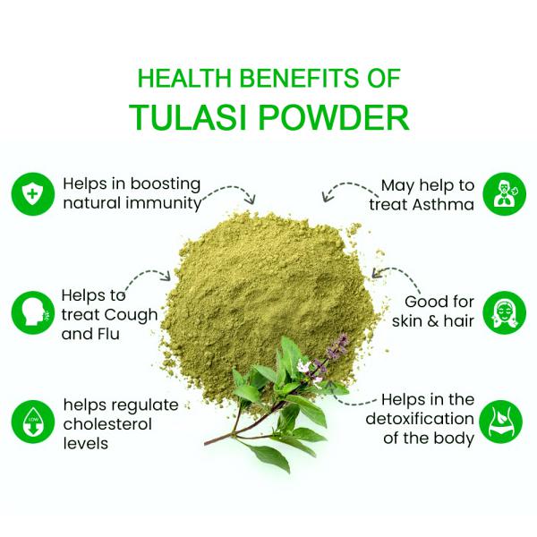 Tulasi powder is made by drying and grinding the leaves of the Holy Basil plant, known for its medicinal and spiritual significance. It is used in herbal teas, Ayurvedic medicines, health supplements, and skincare formulations to support respiratory health, immunity, and stress relief. Rich in antioxidants, Vitamin C, and essential oils, it helps combat infections and inflammation. Tulasi powder is a key ingredient in traditional wellness practices.